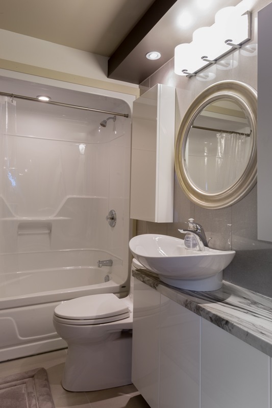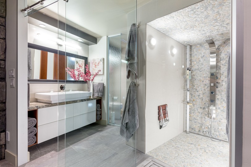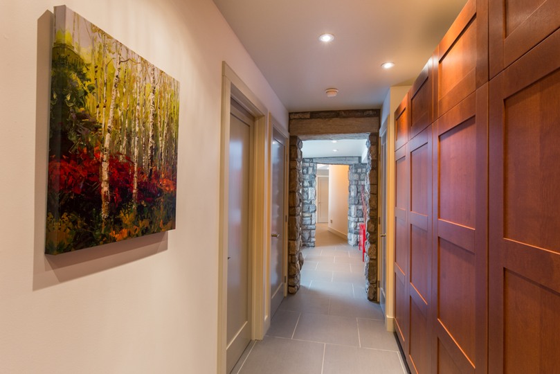 The West wing contains two large bedrooms, with views of the lake and highlights a queen size bed and bunk beds in each room.  A large 4-piece bathroom with vessel sink on a marble vanity is conveniently located for occupants of the West wing to share.