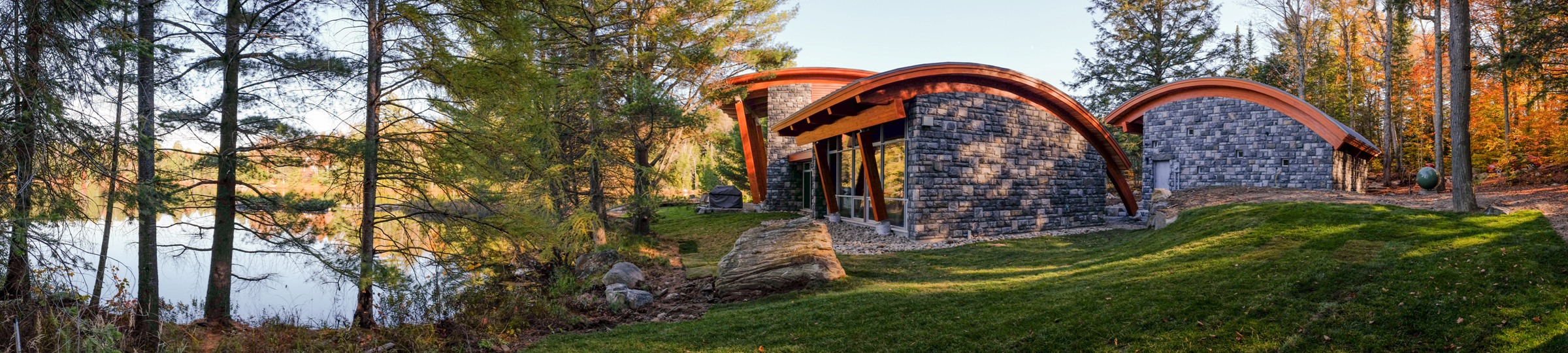 This home sits on an exposed plateau of Canadian Shield at the base of a point within meters of the lake on one side and the bay on the other.  Local granite clad the exterior of the building while heavy timbers support and create the roof structure.  The main portion of the building boasts 25’ high floor to ceiling windows, a central two-sided fireplace with hand cut granite stones, stone tile floors throughout, a Great Room surrounding the fireplace, oversized sliding patio doors alongside of the Dining Room, a Chef’s kitchen, complete laundry facilities, 2-piece powder room, and access to the Muskoka Room and Upper Loft Level.