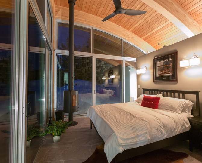 The very private master bedroom is on the main level in the East wing and features a king-size bed, high efficiency wood burning stove, a large walk-in closet and oversized 3-piece en-suite facing the wetlands with the water’s edge only meters away.